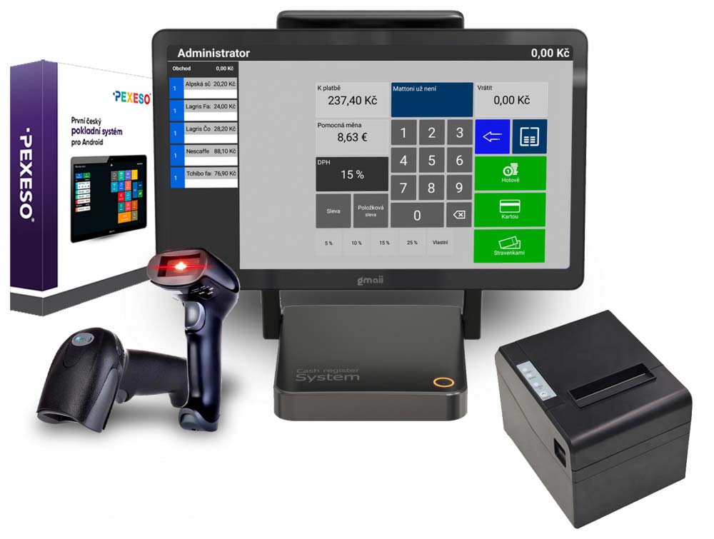 Kompletní pokladní sestava pro obchody obsahuje All in One PC se 4GB operační paměti a 64GB SSD disk s Android 11, pokladní systém PEXESO Obchod a rychlou termotiskárnu účtenek, pokladní zásuvku a čtečku čárových kódů. Získáte tak kompletní a kvalitní řešení pro váš obchod, bez nutnosti dokupovat další hardware a software